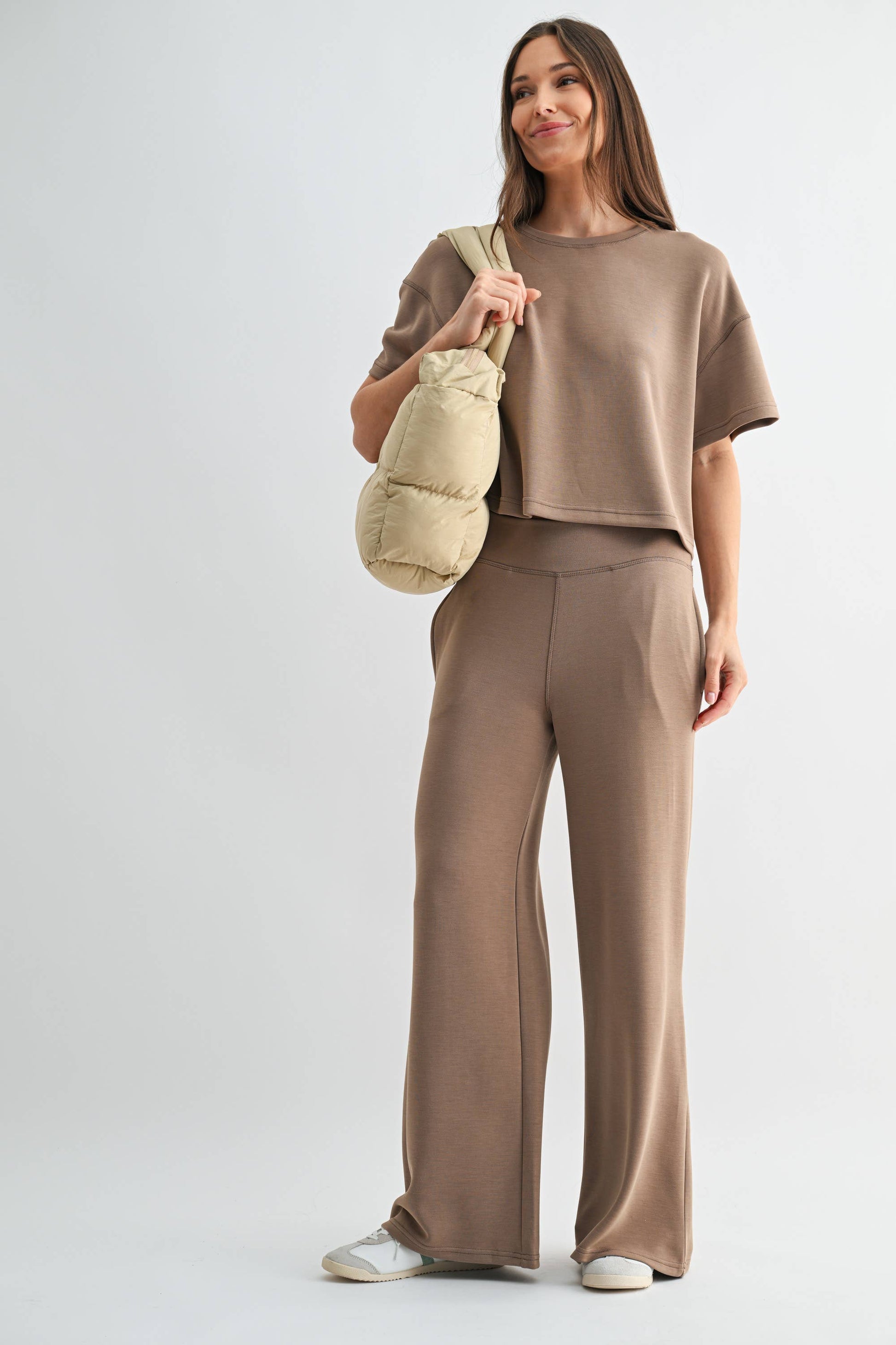 City polish meets coastal ease in the Laguna Flow Set. Crafted from buttery-soft, lightweight scuba fabric, this elevated essential set includes a relaxed tee with a slight drop shoulder for a modern drape and ease of movement. The matching pants feature a smooth, wide fold-over elastic waistband and side pockets for function without compromising form.