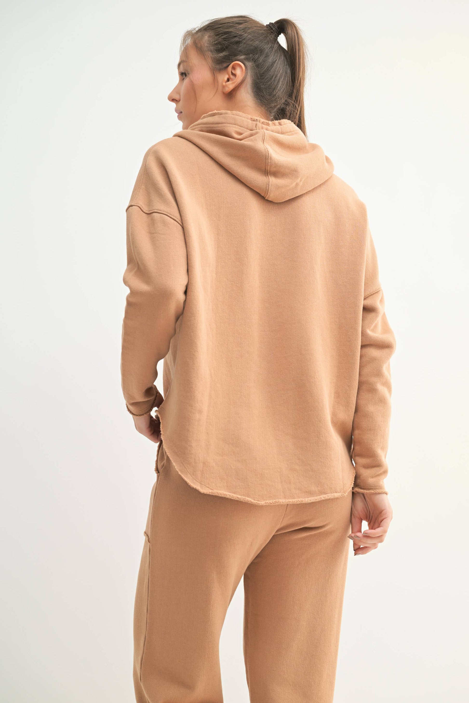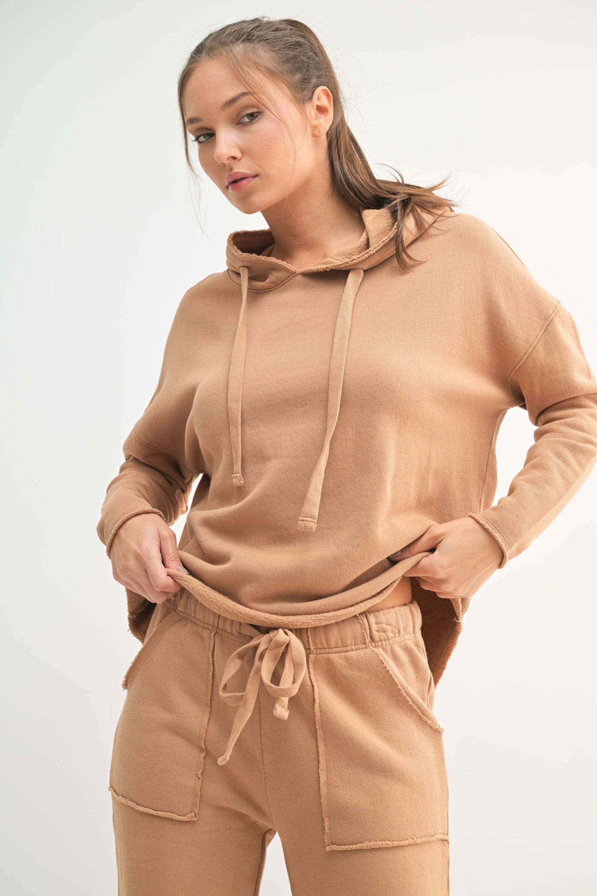 Features a big drawcord and raw-edge hem for a loved, worn-in vibe. Garment-washed for a uniquely soft feel. Perfect for errands, post-gym, or casual everyday wear!
